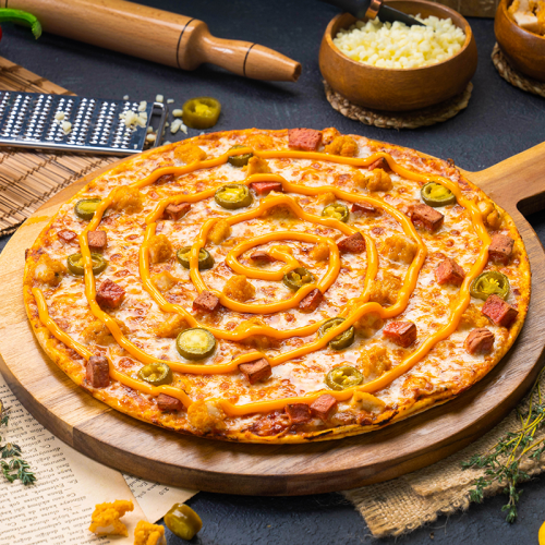 Mozarella Peyniri, Pizza sosu, Baharatlı Tavuk, Küp Sucuk, Cheddar Peyniri, Jalapeno
